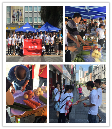 7月16日上午,黄文浩书记以及队伍指导师吴祥庭老师来到五马街,亲切慰问正在进行食品安全知识宣传的“食品安全温州行”暑期社会实践队,为队员们送去了夏日饮品。并食品安全实践队的队员们别出心裁,准备了新鲜的蔬菜水果,与食品安全常识手册一同赠予现场参与问卷调查的市民朋友。“食品安全-温州行”暑期社会实践队,2016年将继承往届的“三动”方针(即动脑、动口、动手)的组队理念。结合专业特色,开展“宣传食品安全”和今年新添的走进温州系列,从教育方面着手普及食品安全。今年还将对温州市食品安全现状进行抽样式调查,最终整理汇报。