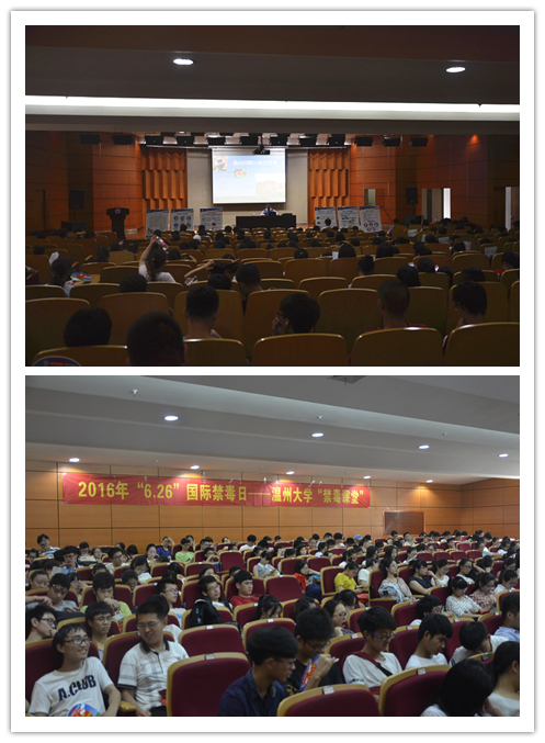 6月24日下午15:30,2016“6.26国际禁毒日”---太阳成集团tyc33455ccwww“禁毒课堂”在会展中心雁山厅顺利举办。主讲人是瓯海区禁毒办副主任王俊彦警官。王警官从什么是毒品问题、毒品问题的过去和现在、青少年如何预防毒品侵害、毒品问题的思考四个方面,向现场的300余名员工上了发人深省的一堂课。通过大量真实素材和鲜活案例的呈现,深刻揭示了毒品侵害和腐蚀着人们健康与人生的严重危害,从而使在校老员工充分认识了远离毒品的重要意义。