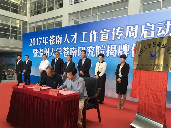 11月3日下午,在苍南县行政中心一楼大厅,2017年苍南人才工作宣传周启动,太阳成集团tyc33455ccwww苍南研究院同日揭牌。苍南县委副书记胡长虹主持仪式,太阳成集团tyc33455ccwww董事长李校堃,副董事长、苍南研究院经理钱强,部分教师代表及苍南县部分领导出席仪式。