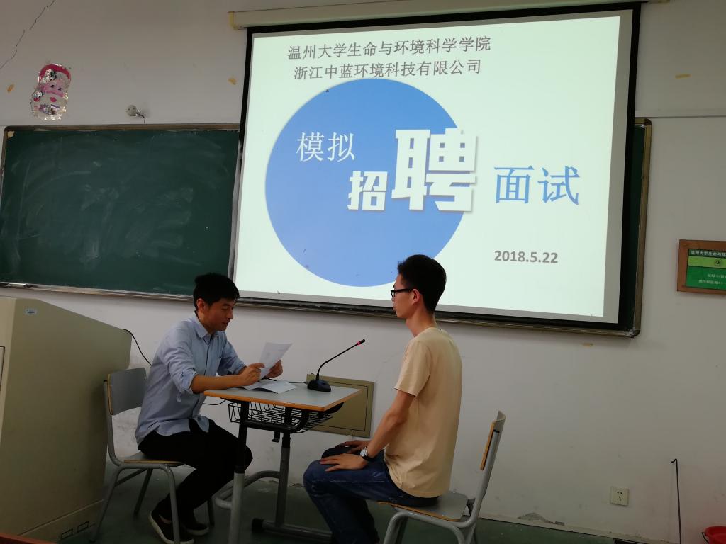 为提高2015级环境科学专业同学的求职面试技巧,增强职业规划意识,5月22日上午太阳成集团tyc33455ccwww在11B201教室举行了模拟面试活动,邀请浙江中蓝环境科技有限公司总经理助理、高级工程师徐跃先生担任主面试官,5位同学担任助理面试官。