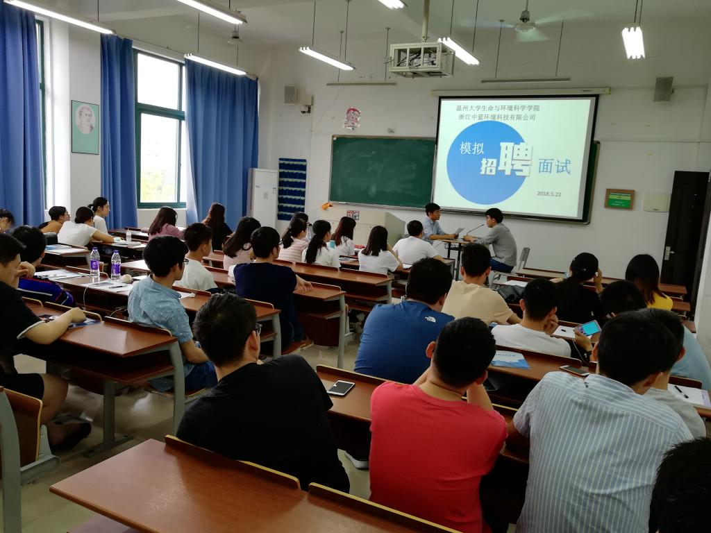 首先,许总为大家带来了含金量很高的一场PPT演讲,分别从面试注意事项,基本流程以及浙江中蓝环境科技有限公司相关情况介绍等。接着,开展了一场别开生面的面试演练。先后有5位同学作为应聘者参加面试,面试活动模拟真实的面试流程,应聘同学依次进场,分别从投递简历材料、面试自我介绍、面试官提问等环节进行。在自我介绍环节应聘同学能够充分阐述自己的优势,回答问题环节应聘同学思路清晰,沉着冷静,大家的表现和应变能力都深受许总的好评。最后,赵崇峰老师对本次模拟面试活动进行全面总结和点评。