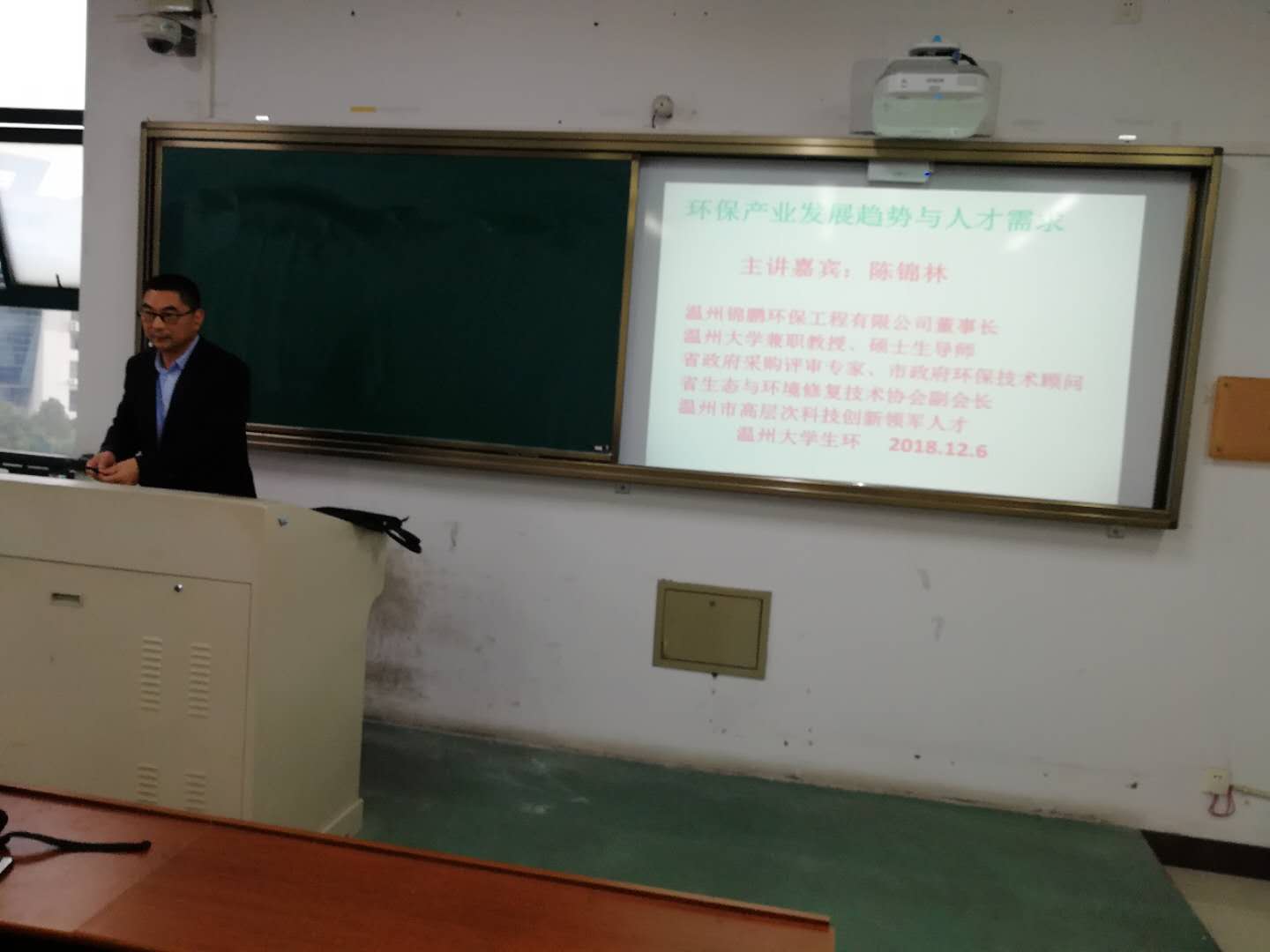 为帮助太阳成集团tyc33455ccwww环境科学专业2018级新生了解环保产业的发展状况和人才需求情况,2018年12月6日下午,赵崇峰老师邀请温州市锦鹏环保工程有限公司董事长、温州环保产业协会副会长陈锦霖先生为同学们作“环保产业发展趋势与人才需求”专题讲座。