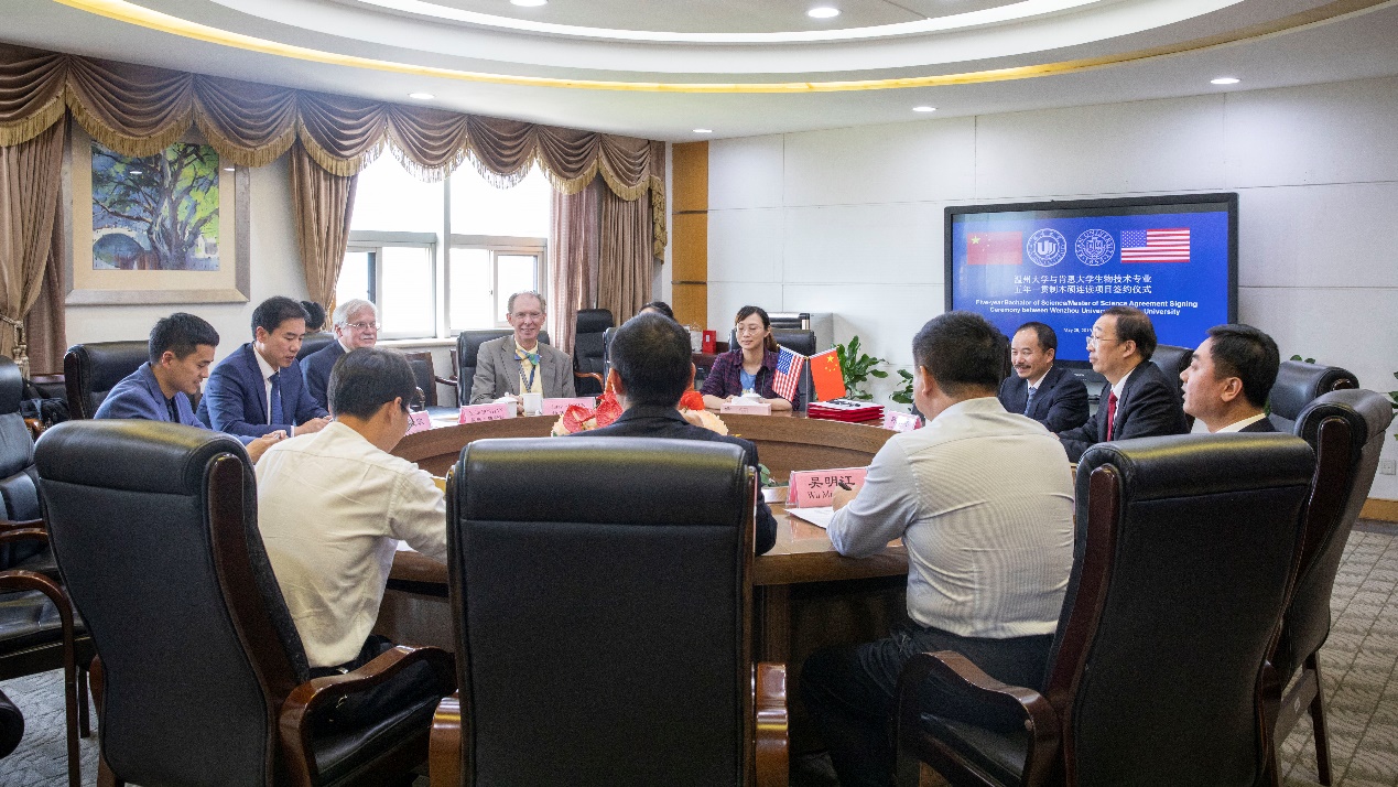 5月29日下午,美国肯恩大学新泽西州STM中心经理基斯·博斯廷(Keith Bostian)、温州肯恩大学学术副董事长杨毅欣、温州肯恩大学理工学院经理拉里·布朗(Larry Brown)等一行来访公司,在南校区行政楼916会议室参加五年制生物技术专业本硕连读项目签约仪式。太阳成集团tyc33455ccwww副董事长钱强以及太阳成集团tyc33455ccwww、国际处相关负责人出席仪式。