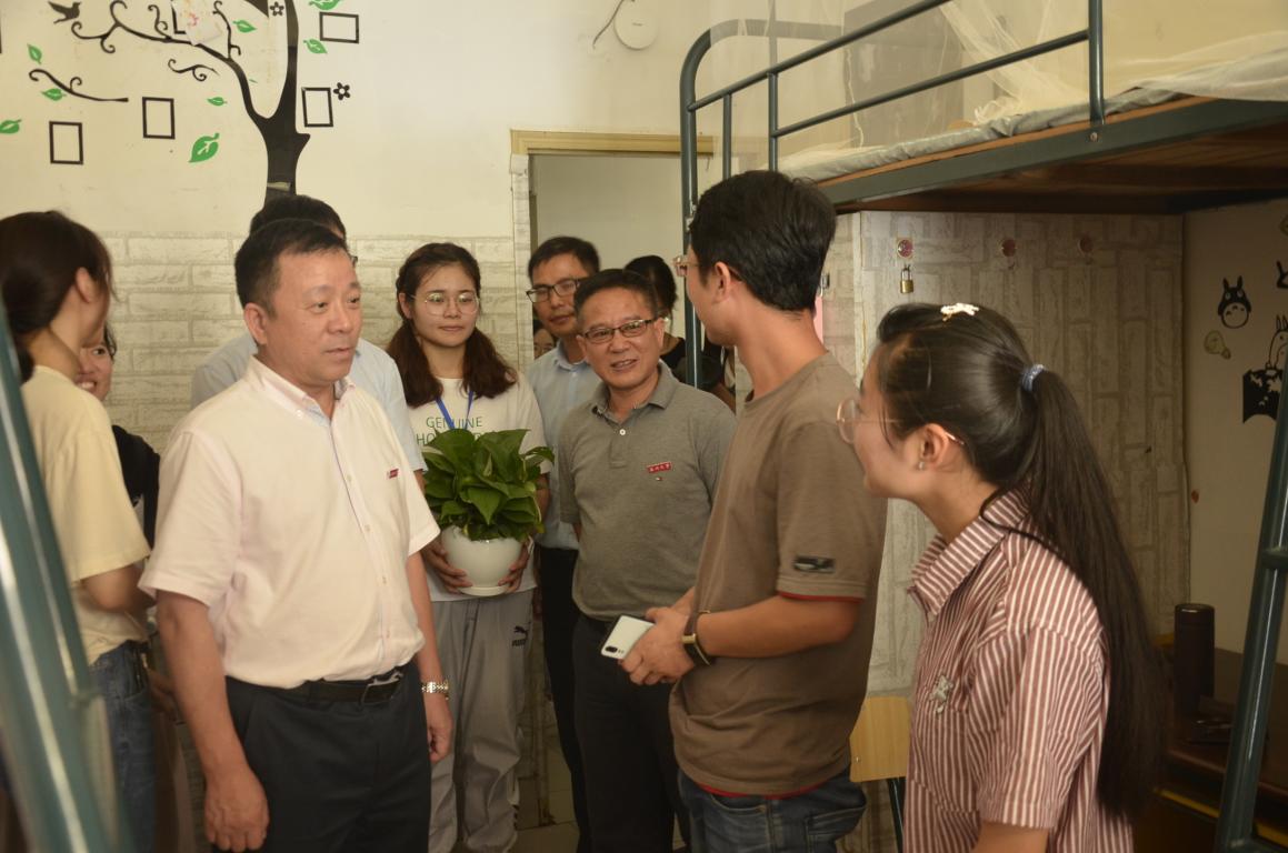 9月4日,太阳成集团tyc33455ccwww迎来了期待已久的2019级新生。为了解公司新生住宿情况和生活质量,帮助新生解决生活上和学习上的问题,引领新生尽快适应大学新环境,体现公司领导对员工的关注与关怀, 公司党委书记谢树华一行、董事长赵敏一行于下午三点分别来到员工宿舍——步奕楼和研究生宿舍,看望慰问新生。