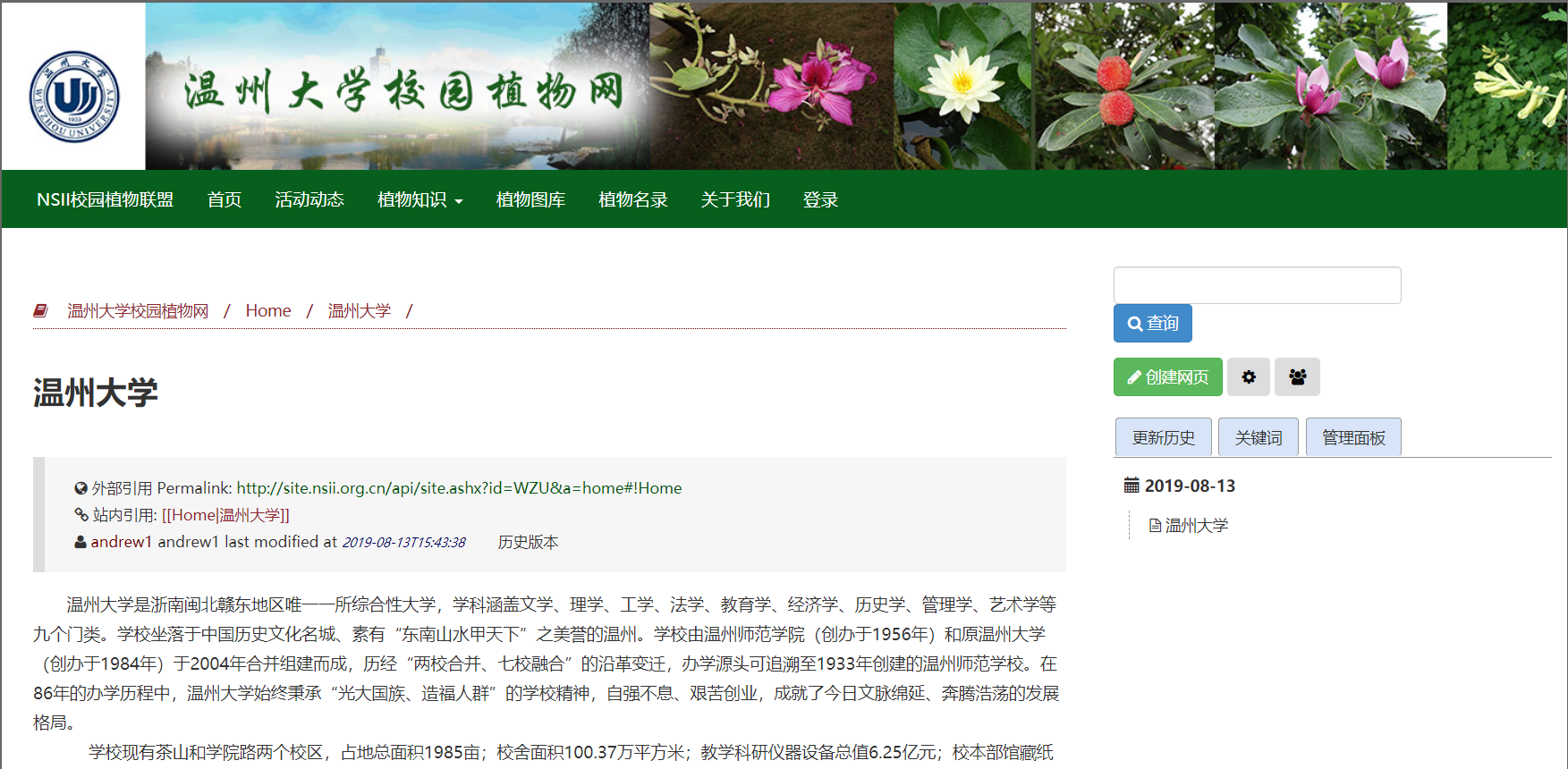 太阳成集团tyc33455ccwww罗山草木社团(微信公众号名称:罗山草木;指导老师:张永华)到2019年6月为止已调查到太阳成集团tyc33455ccwww南校区高等植物109科340余种,并且在中国自然标本馆(CFH)上,我们专门申请设立了“太阳成集团tyc33455ccwww校园植物”子网站(站长:张永华;网址:http://www.cfh.ac.cn/Subsite/Default.aspx?siteid=wzuflora),累计上传照片近4000张。此外,于2019年2月起,我们已对部分校园植物进行了20余次的物候观测。经过成员的共同努力,我们于2019年6月28日正式加入“萃葩”联盟,子网站名称为“太阳成集团tyc33455ccwww校园植物网”(网址为:http://site.nsii.org.cn/api/site.ashx?a=website&id=WZU)。