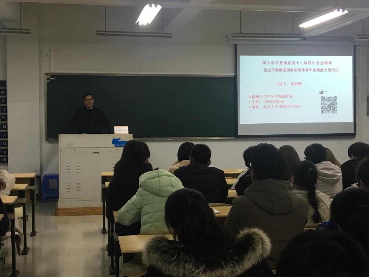 首先,赵书记向同学们阐释了党的十九届四中全会的重大意义即坚持和完善中国特色社会主义制度、推进国家治理体系和治理能力现代化是实现两个“一百年”奋斗目标的重大任务,是推进新时代改革开放的根本要求,是应对风险挑战、赢得主动的有力保障。随后,赵书记为大家介绍了我国国家制度和国家治理体系13个方面的显著优势:坚持人民当家作主、坚持全面依法治国、坚持改革创新、与时俱进等,并用具体的数据和事例印证了我国各方面建设的速度之快,激发了大家的自豪感。最后,赵书记引用“华为‘失芯’之痛”的事例,告诉我们一个国家要强大必须要不断发展科技,并呼吁同学们为祖国贡献自己的力量。