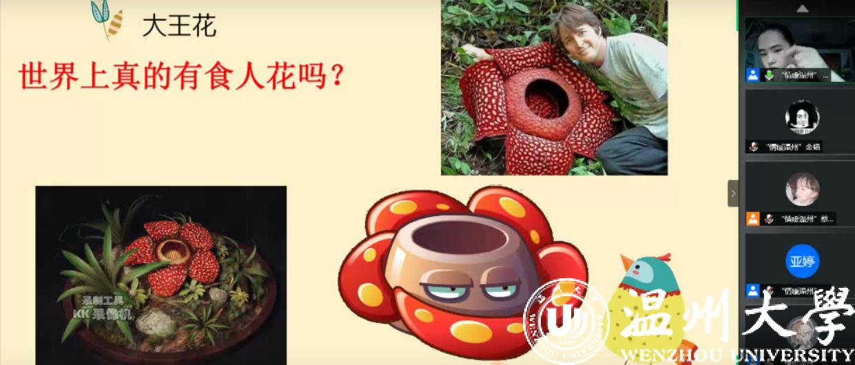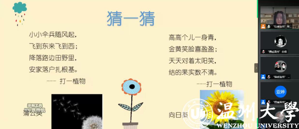 为了培养小朋友们对植物世界的好奇心和探索欲,“情暖温州”暑期社会实践队于2020年7月11日下午两点在腾讯会议上开展了“世相万千:身边的多样植物”网络课堂。本次课程为期一个小时,由蔡梦瑶和郑奇同学作为主讲人,上课的成员为医睦之家的小朋友们。