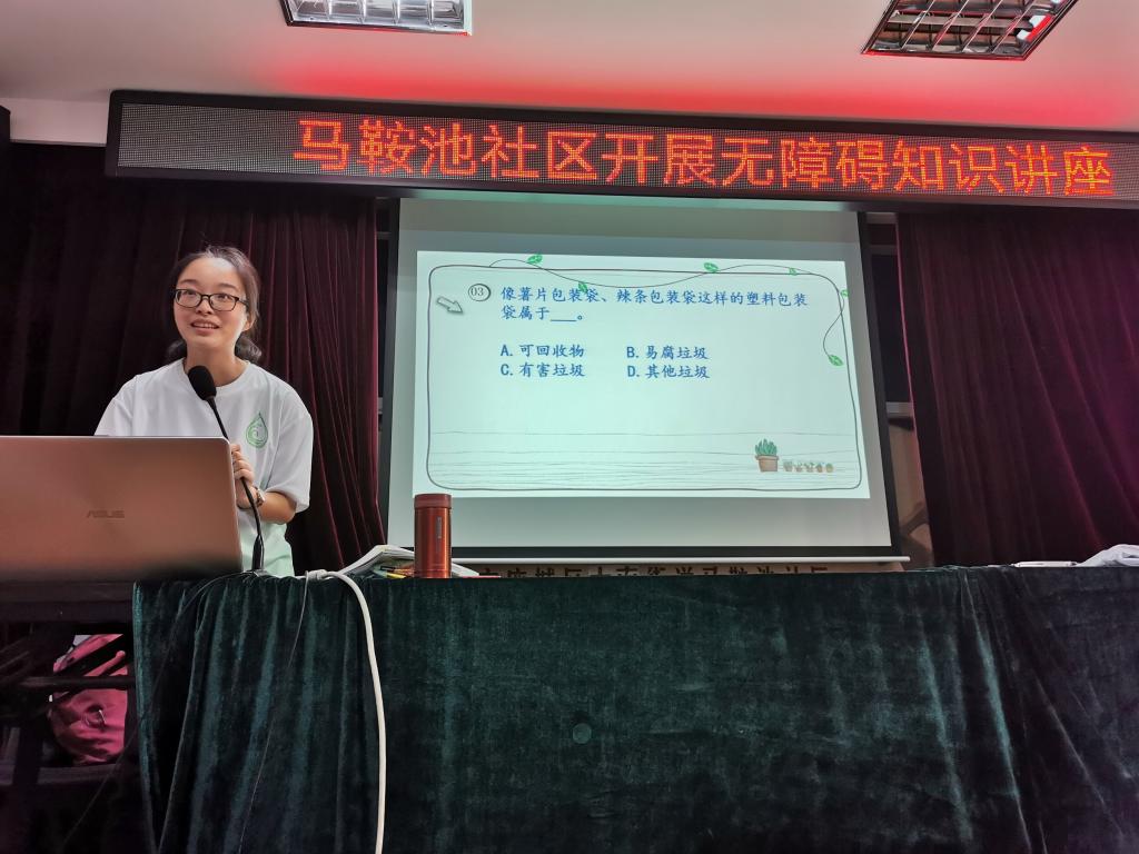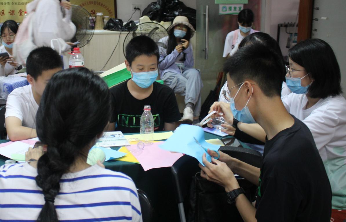 当负责宣讲的队员抵达马鞍池社区,宣讲活动便有条不紊的开展起来。本次的宣讲主要由郑含潇同学主持,答题则采用小组积分制的形式。首先,一个动画视频开启了本次宣讲的内容,也道出了绿色生活方式的原因。接着,郑含潇同学用简洁清晰的语言讲解了垃圾的四种不同类型,讲解后的10道抢答题成功调动起了小朋友们的积极性,也巩固了先前所学的知识。随后进行的“变废为宝”的小组游戏更是将活动氛围推向高潮。实践队的队员们加入各个小组,与小朋友们一起利用剪刀,胶带,彩纸等简单的材料,发挥自己的创意将矿泉水瓶变废为宝,各小组时而激烈的讨论,时而分工合力制作,最终每个小组都有了充满创意的成果,各小组代表也对其创作想法作了简要的说明。最后,郑含潇同学结合实际生活讲述了绿色出行以及绿色生活的意义。时间过得飞快,在本次宣讲活动的结尾,实践队的成员们为小朋友们送上了精心准备的具有纪念意义的小礼品。