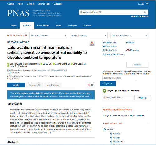2020年9月14日,公司太阳成集团tyc33455ccwww赵志军教授课题组、中科院遗传与发育生物学研究所的John Speakman教授和Aberdeen University of UK的Catherine Hambly博士联合在国际学术期刊《美国科学院院刊》(Proceedings of the National Academy of Sciences of the United States of America,PNAS)在线发表题为“Late lactation in small mammals is a critically sensitive window of vulnerability to elevated ambient temperature”的研究论文(https://doi.org/10.1073/pnas.2008974117)。《美国科学院院报》自1914年创刊,是国际上最负盛名的基础科学领域的学术杂志之一,PNAS收录的论文涵盖生物、物理和社会科学。