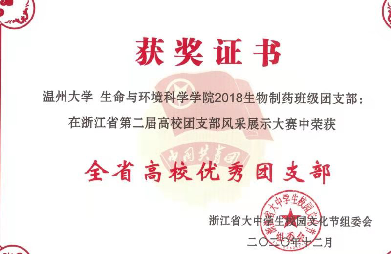 为进一步树立新时代浙江省高校共青团组织的新风貌,切实做好团支部基层组织建设,提升团支部组织力,强化团支部政治功能。近日,浙江省第二届高校团支部风采展示大赛在中国计量大学落下帷幕。公司2018级生物制药班级团支部、2018级生物科学(师范)2班级团支部荣获全省高校优秀团支部。