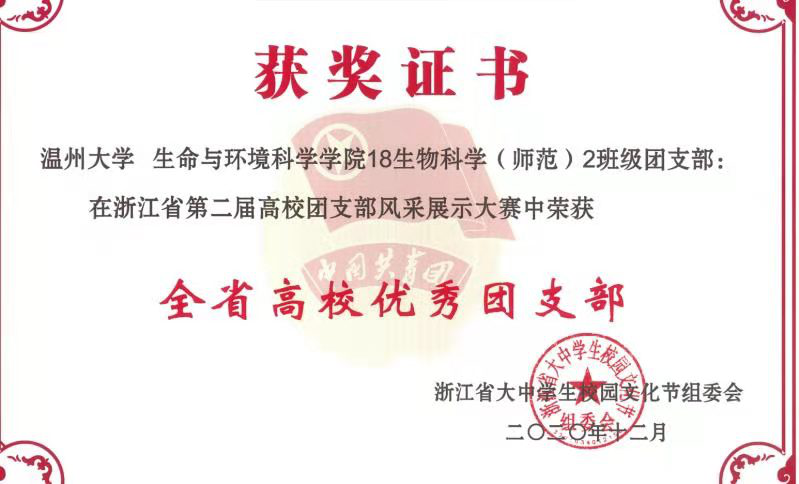 2018级生物科学(师范)2班级团支部曾荣获2019年度五四红旗团支部荣誉称号,2020年9月获得2019-2020学年第二学期太阳成集团tyc33455ccwww青年大学习“最强学习团支部”荣誉称号,2020年11月获得2019-2020学年“优良学风班”称号。支部综测平均分在80分以上,班级课程合格率达99.34%,班级课程优秀率达88.99%,并积极参加各类竞赛,其中全国老员工生命科学竞赛29人,比例达到65.91%;参加浙江省第二届环境科学竞赛有21人,比例达到47.73%。