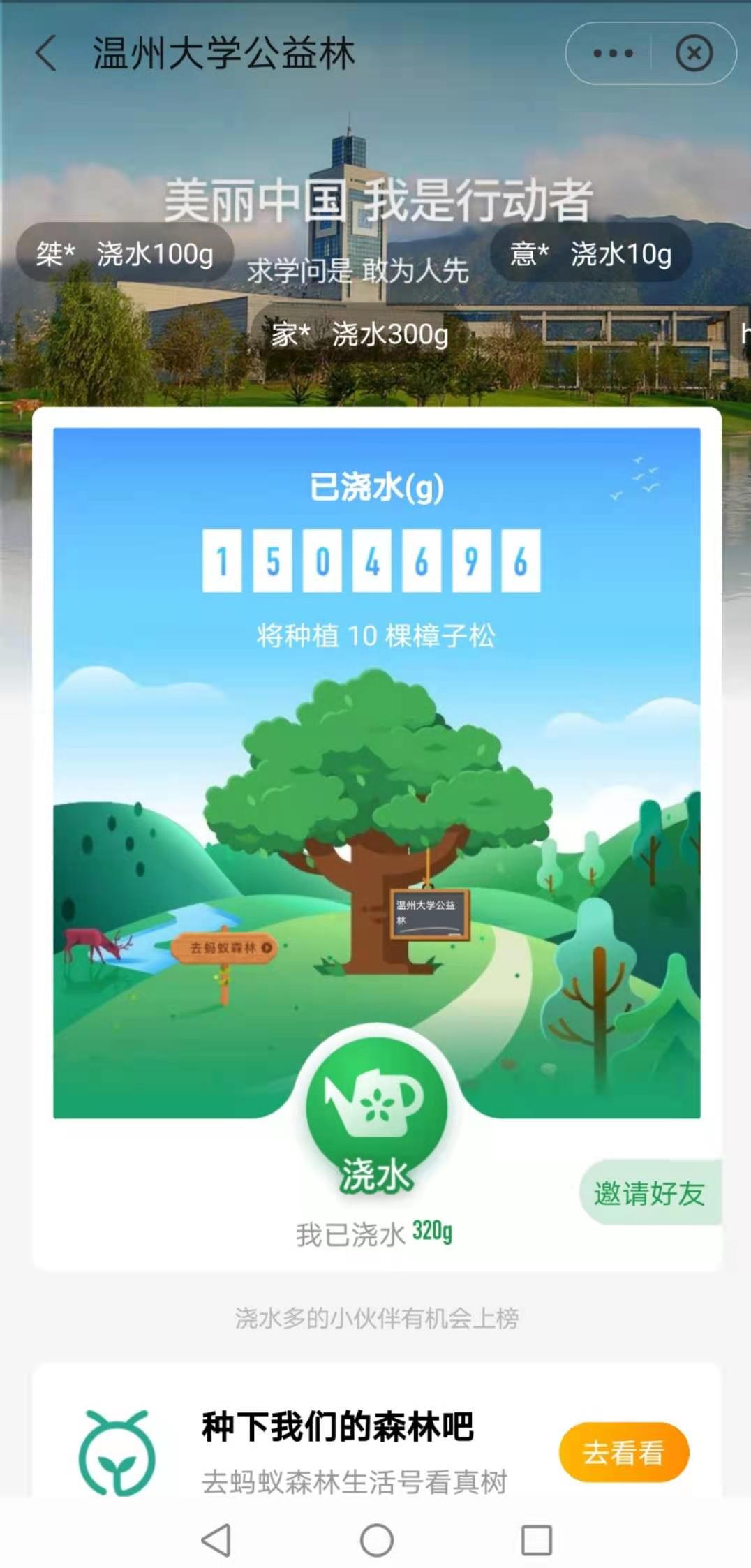 除此之外,公司师生在网络上发起“云浇水”的号召。依托支付宝—蚂蚁森林公益林平台,鼓励全校师生为“太阳成集团tyc33455ccwww公益林”浇水,成为建设美丽温大、美丽中国的行动者。