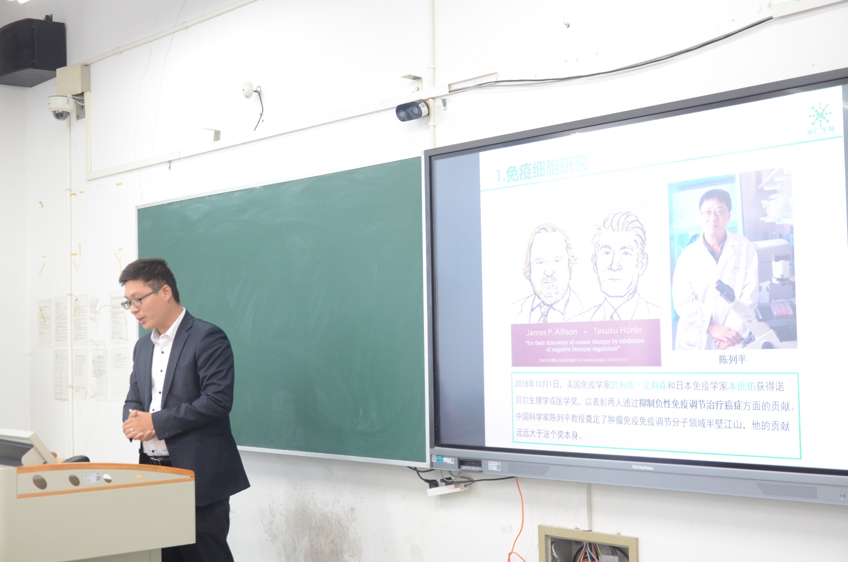 随后,郑金峰老师就制药专业基础知识进行了系统性的讲解。他向同学们介绍了细胞疗法的发展与进步,分析了胞疗法在国家的地位以及国家对此项目政策的支持。其中,郑老师对免疫细胞的讲说,引发了同学们的思考,同学们在思考中渐渐的对自己的专业有了更深的认知,也在心中树立起了新的、更加恢宏的人生目标。