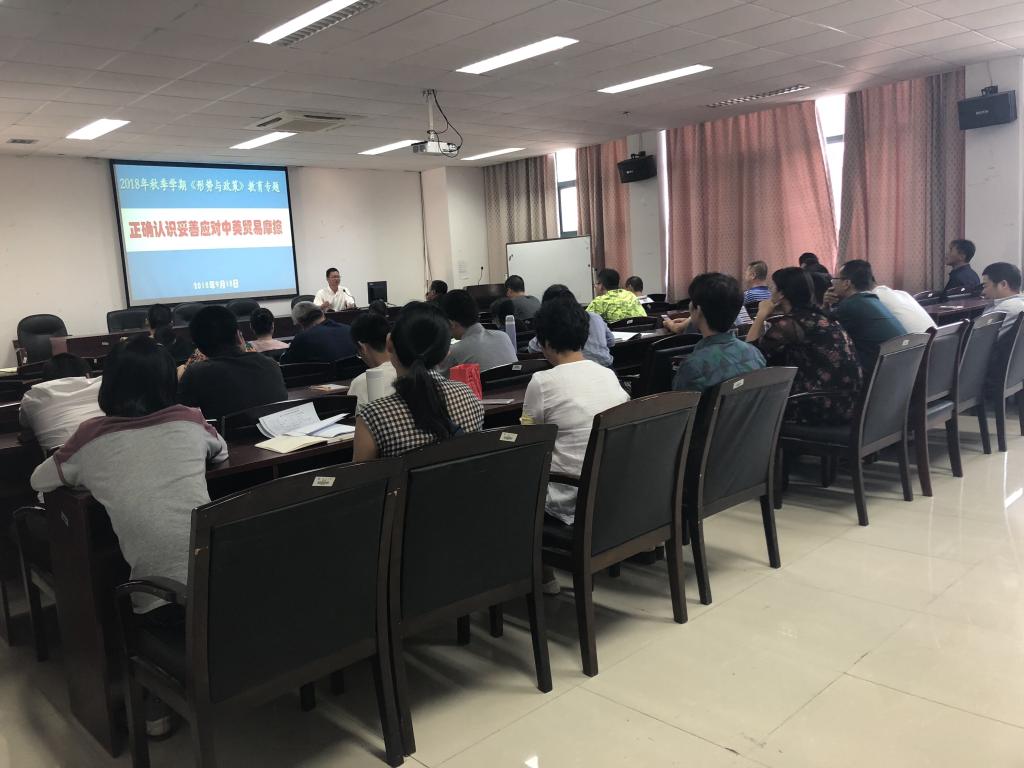 学习会上,陈书记从关于正确认识、妥善应对中美贸易摩擦问题以及目前中美贸易战的进展情况、美国贸易霸凌主义的伎俩和实质、中美贸易战给我们带来的机遇和挑战、积极应对与切实维护改革发展稳定大局等方面进行了详细的解读。陈书记在学习会上强调,全体师生要正确对待中美贸易摩擦,积极主动了解关注国际形势,坚决维护国家的核心利益。