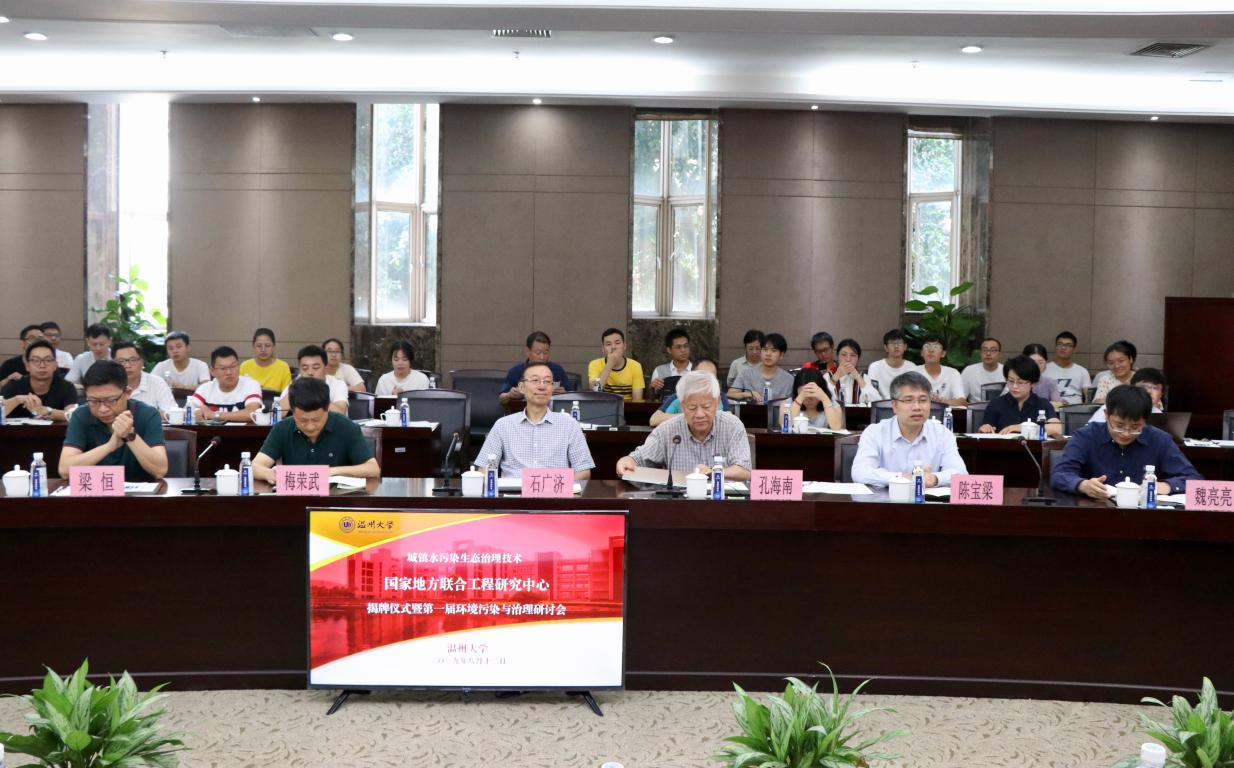 揭牌仪式后,第一届环境污染与治理研讨会在太阳成集团tyc33455ccwww召开。上海交通大学孔海南教授、浙江大学陈宝梁教授、哈尔滨工业大学梁恒教授、浙江省环境保护科学设计研究院梅荣武教授以环境污染与治理为主题做了大会报告。上海交通大学孔海南教授针对高品质"二元供水"技术体系开发与温州雁荡山周边普及思考进行了详细的介绍,对温州市的供水技术体系的开发具有指导性意义。浙江大学陈宝梁教授介绍了石墨烯基环境功能材料构建及其污染控制应用,为环境功能材料的研发及应用带来了新的思路。哈尔滨工业大学梁恒教授介绍了低压膜滤净水技术,深入介绍了膜滤技术的优点及运行的原理。浙江省环境保护科学设计研究院梅荣武教授主要介绍了城镇污水处理厂提标至地表准IV/III类水标准工艺技术路线及案例,对温州市城镇污水处理厂实现提标具有重要参考价值。