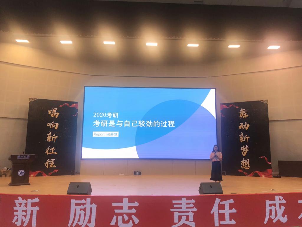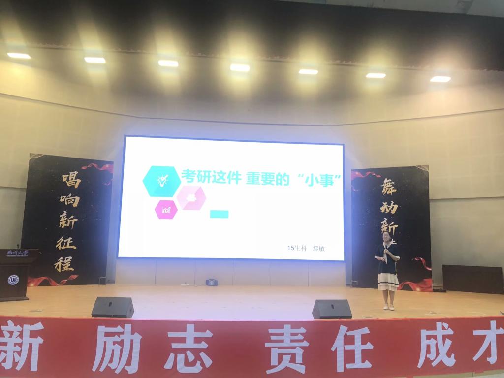 每个人都是一朵花,有决心、有耐心,方可绽放得更惊艳、更持久。而她更像是梅花,经得起严寒,耐得住寂寞。平心静气、养精蓄锐是她的花语,戒骄戒躁、厚积薄发是她埋藏于心的信念。考取南京大学的梁嘉慧同学在会上以《考研是与自己较劲的过程》为题,分享了自己的考研心路历程,她希望学弟学妹们管理好自己的心态,处理好自己的时间安排。安然于无闻,执着于真知。静,能十年磨剑;动,则一鸣惊人。志在学术,便不畏风雨兼程。纵然崇山峻岭,她一直在攀登!考取浙江大学的李以格同学结合自己的学习和生活经历从考研目标的选择、具体备战考研、调整心理状态,到后期的联系导师等方面做了细致全面的讲解。在具体备战考研方面,她还给出了每个学科的具体学习方法,并推荐了实用的网络资料和参考书。并以时光不会辜负每一个努力奔跑的追梦人来鼓励公司莘莘学子。千磨万击还坚劲,任尔东西南北风。持一颗单纯的心,固执的在考研的这座险山上攀爬,仿佛没有什么东西能够阻挡他前进的步伐,最终在山顶胜利高歌!以400分的高分考取北京师范大学的黎敏通过自己的亲身经验给出了考研三部曲:一部曲:选择是关键,二部曲:效率是法宝,第三部:坚持是核心。他鼓励大家在未来考研的初试与复试中不要紧张、不要彷徨,长期的努力与挥洒的汗水在那时应该得到见证,不要在最后一个关口前功尽弃,不忘初心,方得始终。