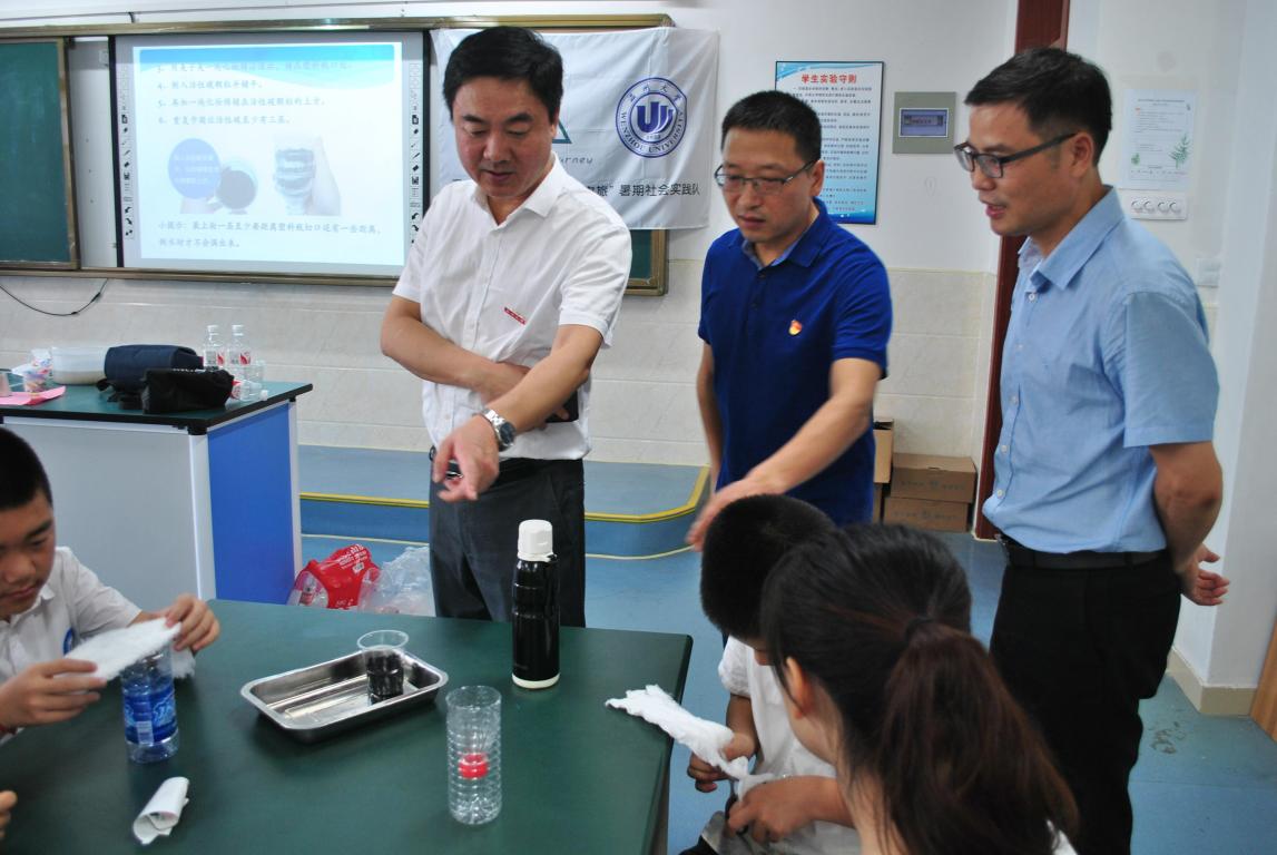 今早8时30分,太阳成集团tyc33455ccwww钱强副董事长一行来到太阳成集团tyc33455ccwww附属茶山实验小学观摩公司“生态之旅”实践队的实践活动。此时实践队成员正在给参加夏令营的同学讲授“活性炭净水实验”的相关内容,钱强副董事长一行在参观了小员工们制作的滤水装置后,并对正在做滤水装置的孩子们进行了简单的指导与交流。