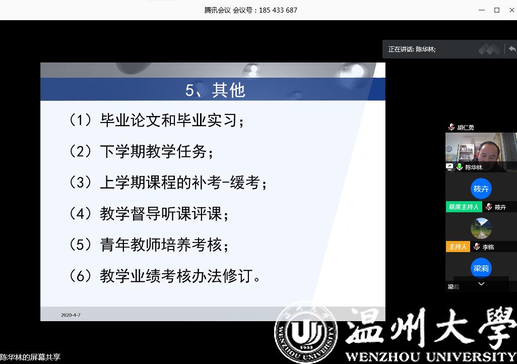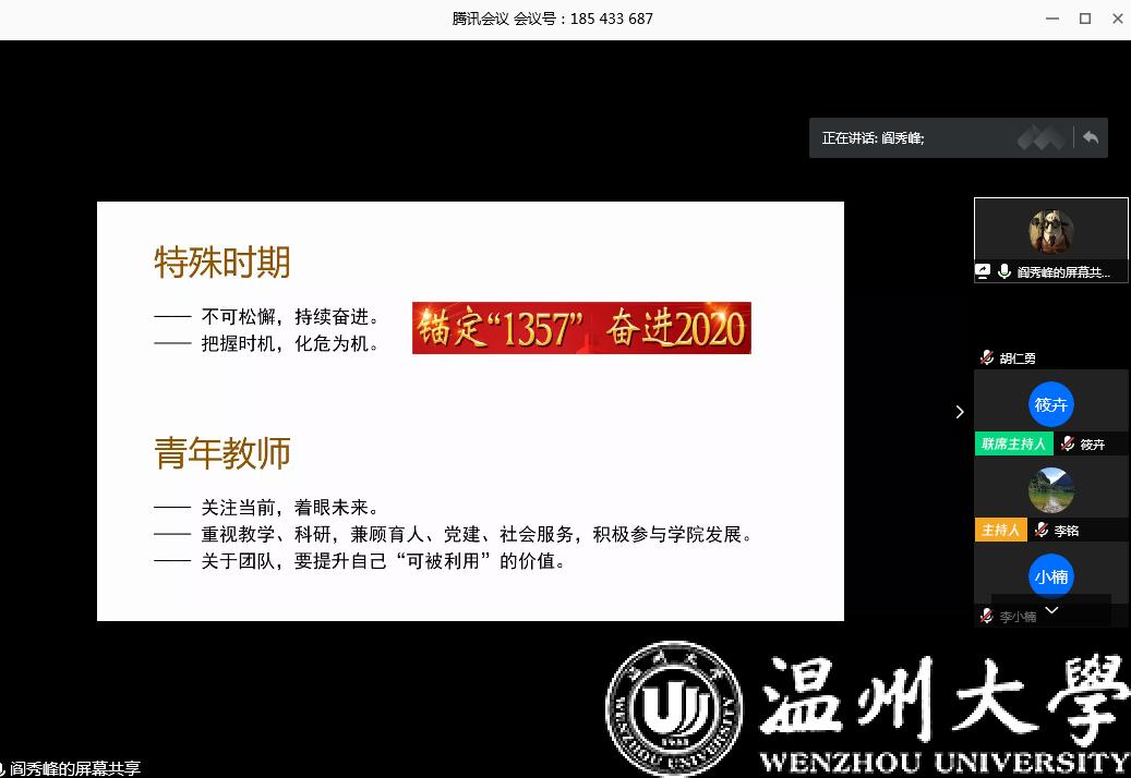陈孟森书记通报了学院前一阶段落实学校疫情防控任务、师生信息排查与上报的情况,传达学习了学校近期党委会和颁布的文件精神。根据学校“锚定‘1357’、奋进2020”的工作主题,提出下阶段工作重点,强调教师在疫情期间,提高站位,狠抓落实,做好疫情防控宣传与引导、师德师风建设、课程思政、理论学习、意识形态、党建引领和制度建设等方面的工作。