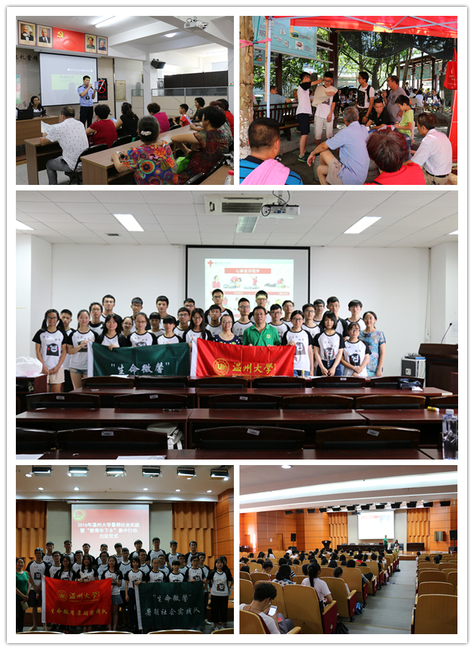 在实践队的活动开始之前,依照惯例由实践队的指导老师郑蔚虹老师主讲,开展动员大会、技能培训、组织生活准备会等活动使得团队在短期内达到团结统一。同时,统一实践队的纪律,明确管理体制。本次实践队的主要活动地点是上蔡村南社区以及梅泉社区,通过有奖知识问答的形式,提高居民们的参与性,增强实践队队员与社区居民的互动性。而急救知识拓展与禁毒宣传活动则是我们暑期实践的特色活动。生命微馨实践队队员在街道旁积极邀请路人一起演示包扎、固定等一系列急救措施; 生命微馨实践队联合社区禁毒办一起开展了构建无毒社区活动,包括禁毒知识ppt展示、知识问答、毒品展示进度宣传单的分发等。