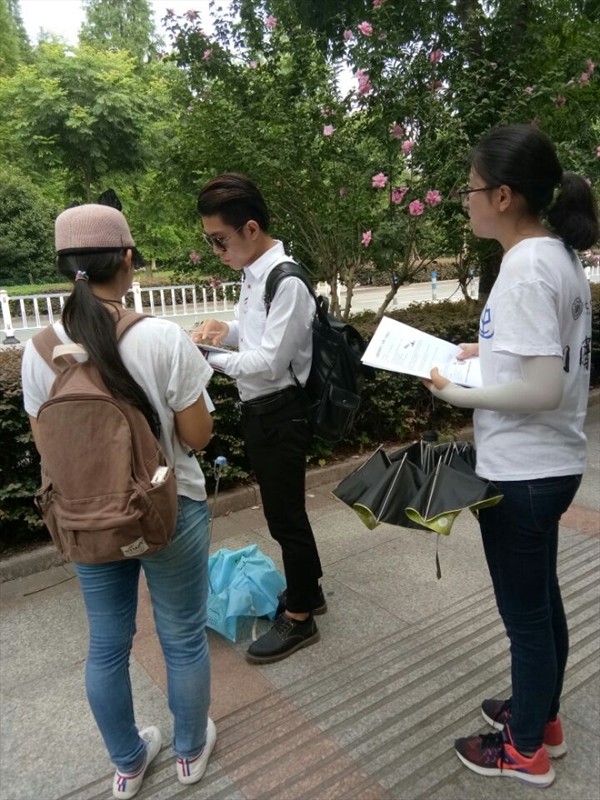 骄阳似火,队员们顶着炎热的夏日,在街上向行人发宣传单宣传自闭症知识,每一个驻足的行人都认真听着队员们的讲解及翻阅宣传单。队员们手中的宣传单一点点地变少,汗水在他们脸上滑落,但他们的心也一点点的变得更加充实。大学城的各个角落里都有我们队员发放问卷的身影,无论是茶山镇上还是商务中心里。路人行色匆匆,不少人都拒绝进行问卷调查,但我们的队员们并不气馁,继续前行寻找着做问卷的行人。水果店的老板、保安大叔、头发花白的老人、员工,无关年龄,无关职业,每一个都是队员调查的对象,希望将自闭症传播出去,让更多的人了解和自闭症。