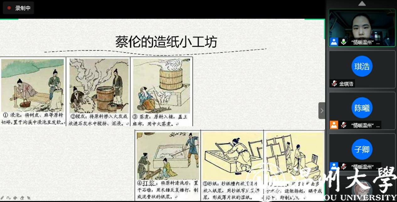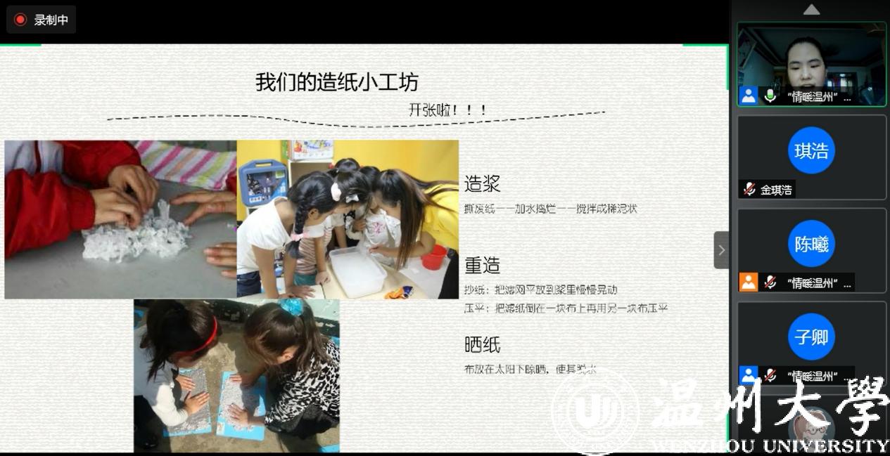 为了提高孩子们的动手能力,传承中华造纸技艺,7月13日上午9点“情暖温州”暑期社会实践队于腾讯会议上开展了“回溯蔡伦,化繁为简,变浆为纸”的实践课程,本次课程由郑奇老师负责主讲,陈曦老师负责实验课程,为医睦之家的小朋友们带来中国古代造纸术的相关课程。