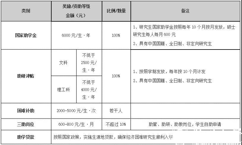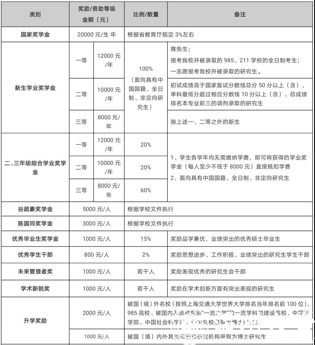 新入学的全日制非定向硕士研究生,文科类研究生每年可获得奖助学金不少于16500元,理工科研究生每年不少于18000元。每年获得奖助学金最高的可超过46000元。