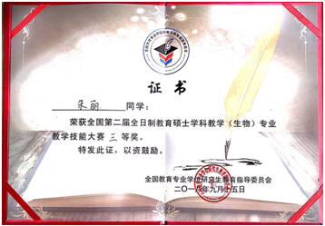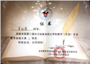 9月15日至9月16日,第二届全国全日制教育硕士学科教学(生物)专业教学技能大赛(决赛)在华中师范大学举行。本次全国大赛代表公司参赛的3位全日制教育硕士研究生曾丽霖、朱丽、李兆真同学全部获得三等奖。