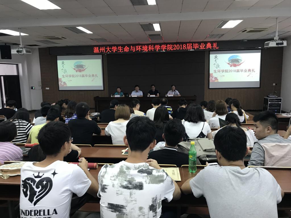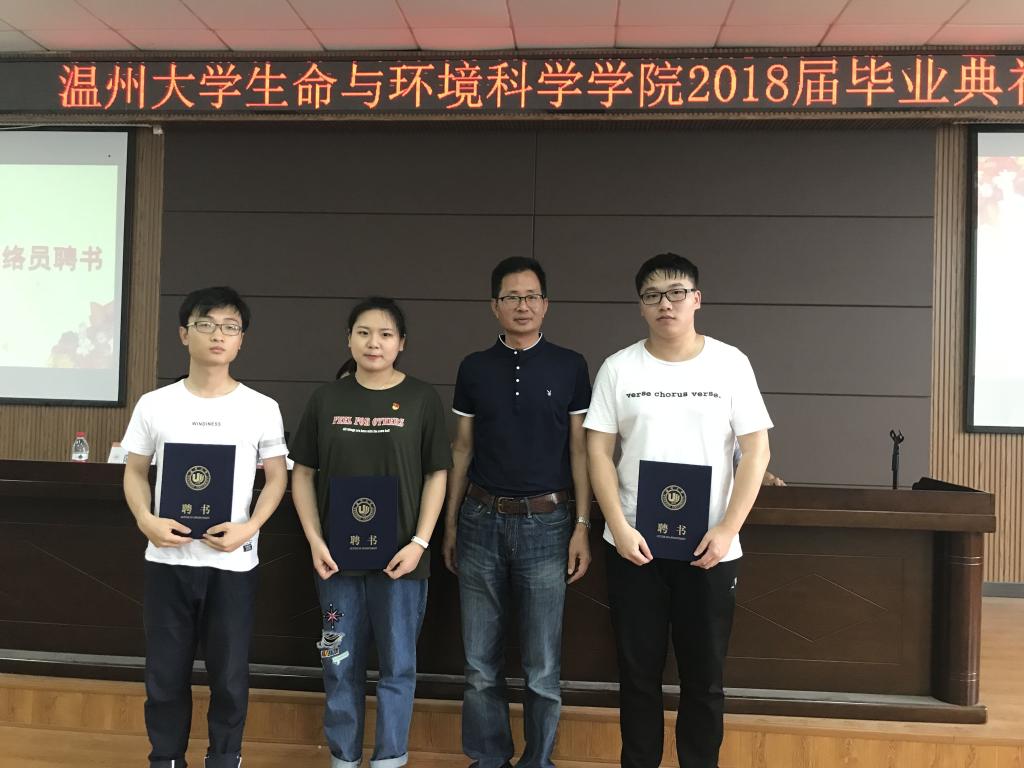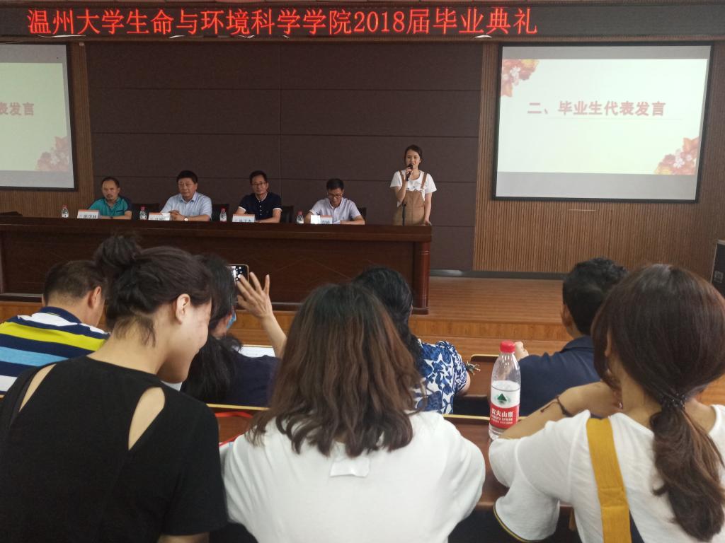 欢送会上,吴明江经理寄语各位毕业生要志存高远、认真做人做事,以 “勇敢、担当、前瞻”勉励大家,并且希望毕业生们未来有更好的发展。接着,陈孟森书记为三名员工联络员颁发学院聘书。本科毕业生代表董蓓蓓同学与在场的老师、同学分享了自己在校期间学习与生活的经历,表达了对温大、生环和导师的感谢之情。院领导为员工颁发毕业证书,这份证书“沉甸甸”代表四年光阴,盛满四年回忆。