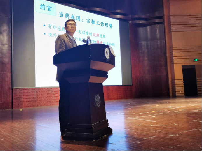 王书记以当前国内外宗教形势为前言,以马克思主义和宗教观思想的冲突为背景,提到当今中国公民中存在宗教信仰的人已近2两亿,当前我国宗教工作形势不容乐观,而温州作为国内宗教传播入口,在这种形势下,对马克思主义宗教观的解读是必要且急需的。然后从宗教的产生与发展,讲到马克思主义思想下的宗教观,最后到中共中央对宗教的态度,循序渐进地向我们解读了马克思主义宗教观。