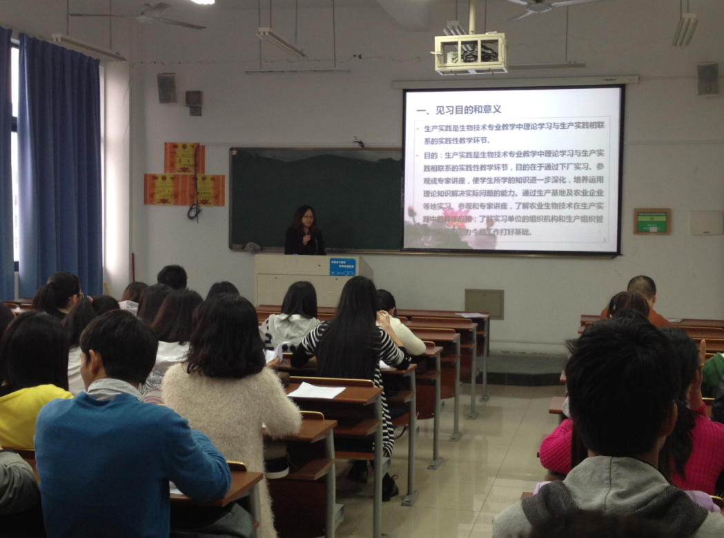 4月21日,公司在11A401召开11级、12级生物技术专业见习动员大会,大会由系主任钱晓薇老师主持,出席本次大会的有陈勇老师、王晓峰老师、郭萍老师等,11级、12级生物技术专业全体同学参加了此次大会。