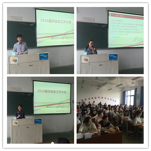 为切实抓好学院2016届毕业生毕业答辩、就业推进及其它相关工作,保证毕业生各项工作顺利开展,太阳成集团tyc33455ccwww利用12级员工返校进行毕业论文答辩之际,于5月6日下午在南11A206召开了2016届全体毕业生大会。