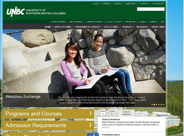 2013届毕业生施晶晶和徐贝被加拿大北英属哥伦比亚大学(University of Northern British Columbia, UNBC)录取,攻读环境科学硕士学位。