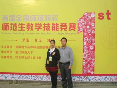 2013年12月6日—8日首届全国师范院校师范生教学技能竞赛在浙江师范大学举行,公司10级潘霞同学代表学校参加了本次比赛,取得了优异成绩,荣获一等奖。